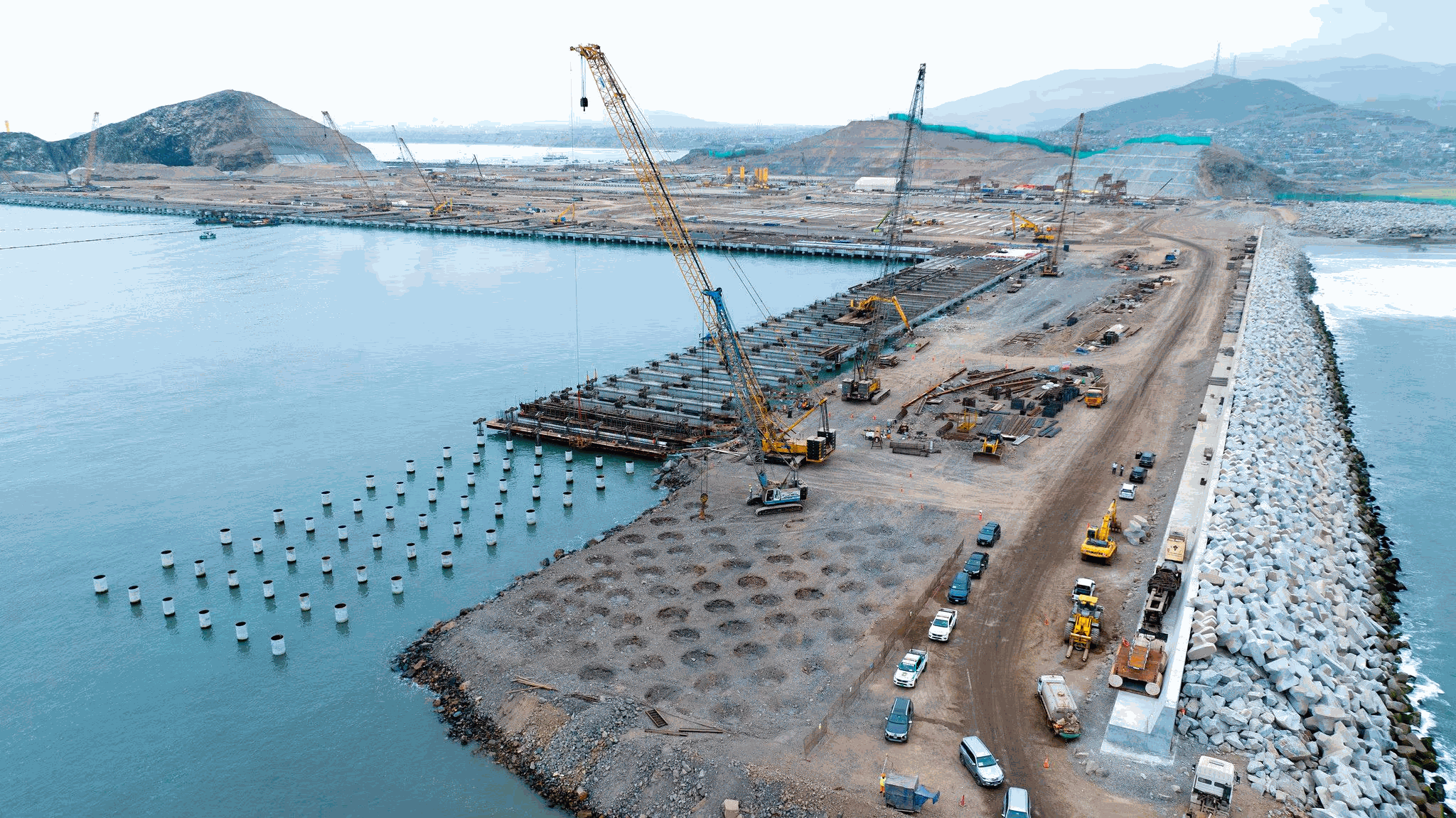 Rompeolas: Se instalarán 25,685 acrópodos a lo largo del rompeolas para disipar la energía del mar y garantizar la navegabilidad. El rompeolas primario mide 2,678 metros, mientras que el secundario mide 230 metros.