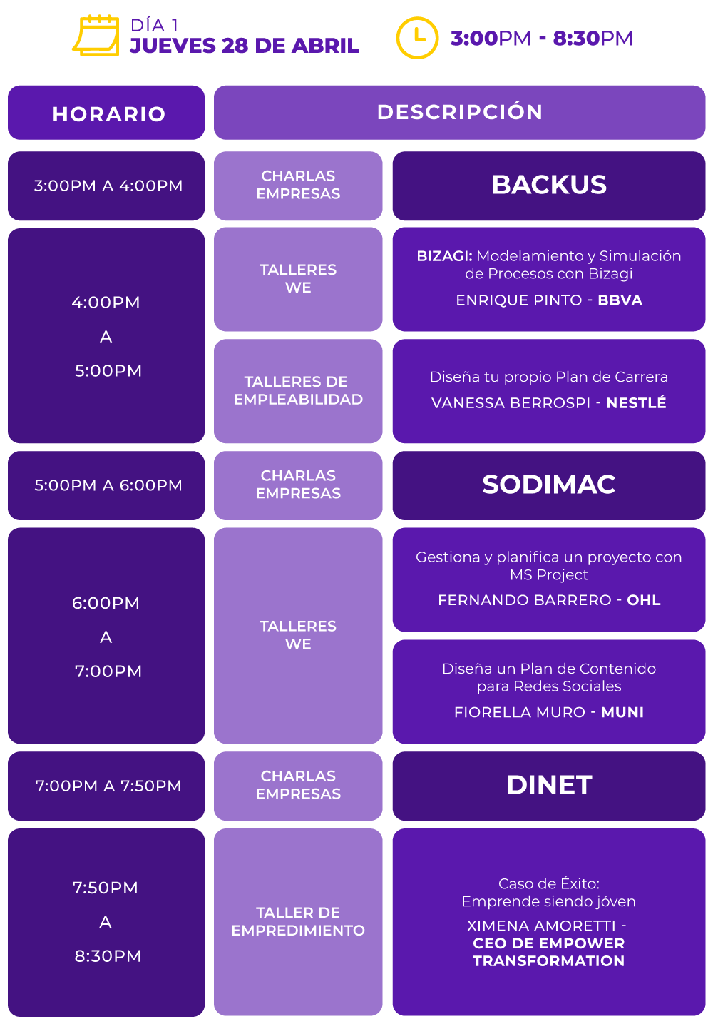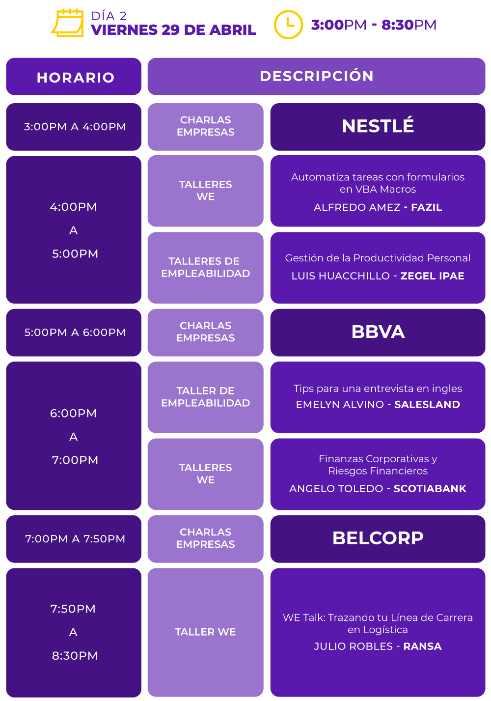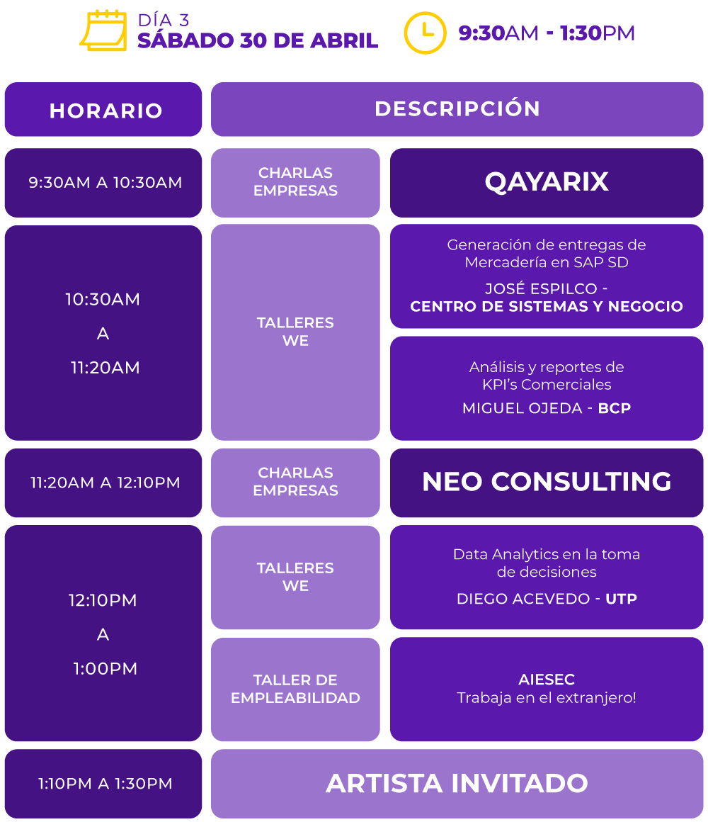 En esta III Edición de nuestra Feria Laboral WE, participa de Charlas empresariales con NESTLÉ, BBVA, SODIMAC, BACKUS, DINET, NEO CONSULTING y BELCORP; talleres de herramientas tendencias, casos de éxito y talleres de empleabilidad que ayudarán a potenciar tus competencias profesionales.