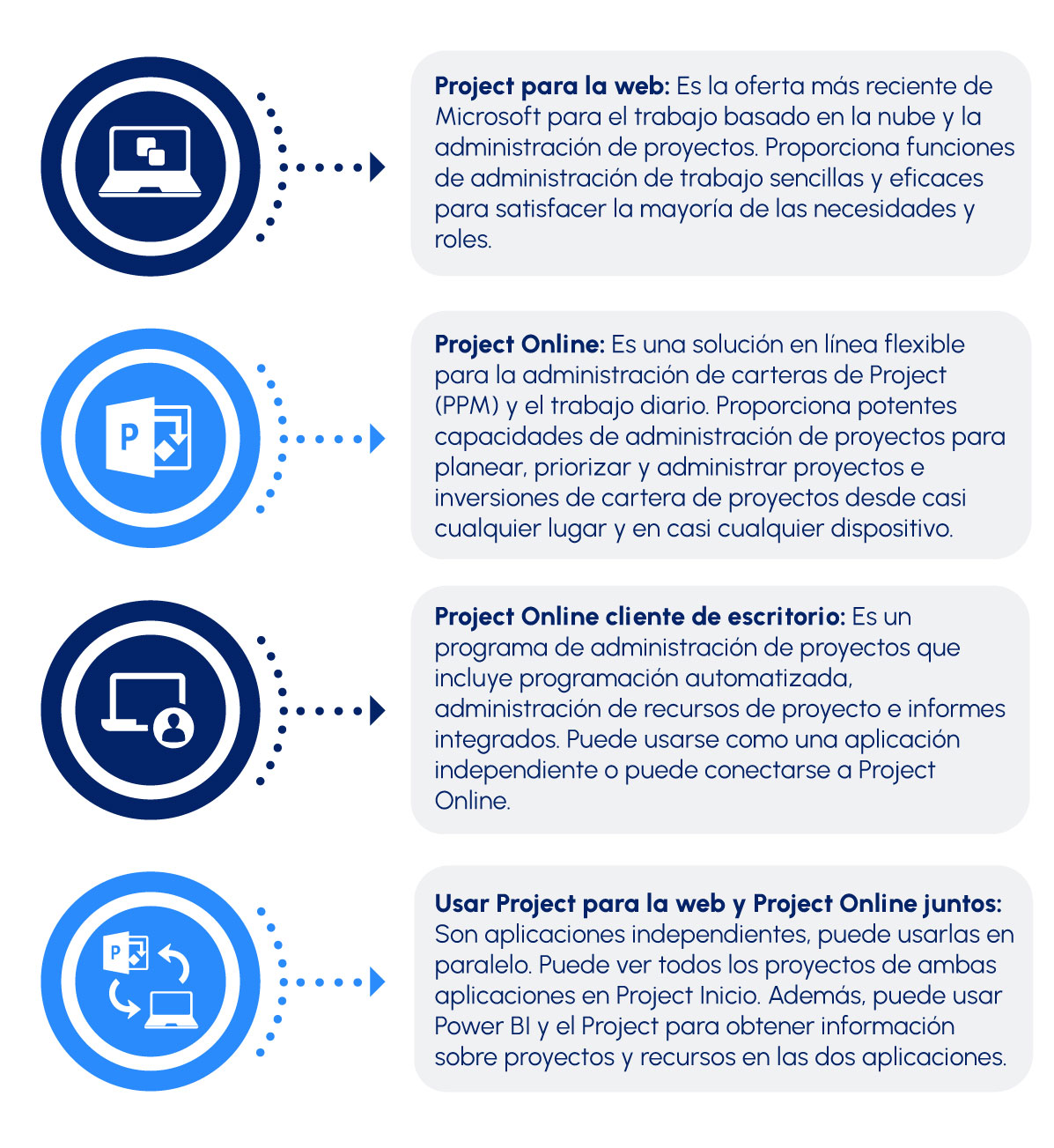 MS Project te ofrece las siguientes extensiones y aplicaciones que te ayudarán a mejorar las necesidades de alguna empresa para la gestión y administración de proyectos: Project para la web, Project Online y Project Online cliente de escritorio.