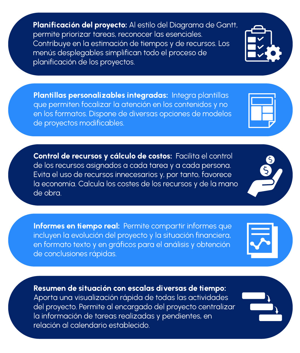 MS Project usa diversos gráficos al estilo de Diagramas de Gantt, para planificar y programar diversas tareas designadas en un tiempo determinado, así como controlar el proyecto, con el objetivo final de gestionar la cantidad de tareas de los colaboradores y evitar los excesos.